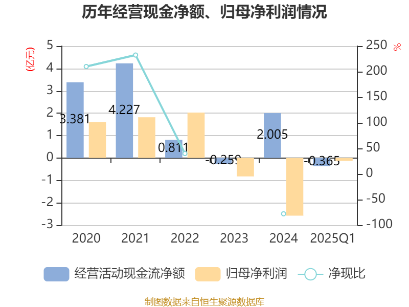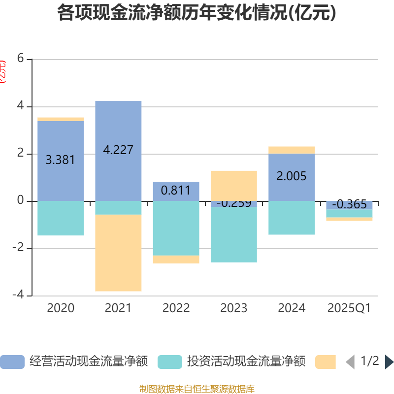 截至2025年一季度末,公司经营活动现金流净额为-3652.13万元,同比减少4286.46万元;筹资活动现金流净额-1388.43万元,同比减少1.31亿元;投资活动现金流净额-3363.91万元爱一配,上年同期为-3473.94万元。