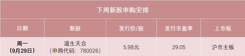 根据目前的发行安排,本周只有1只新股申购,即周一(9月29日)的沪市主板新股道生天合。