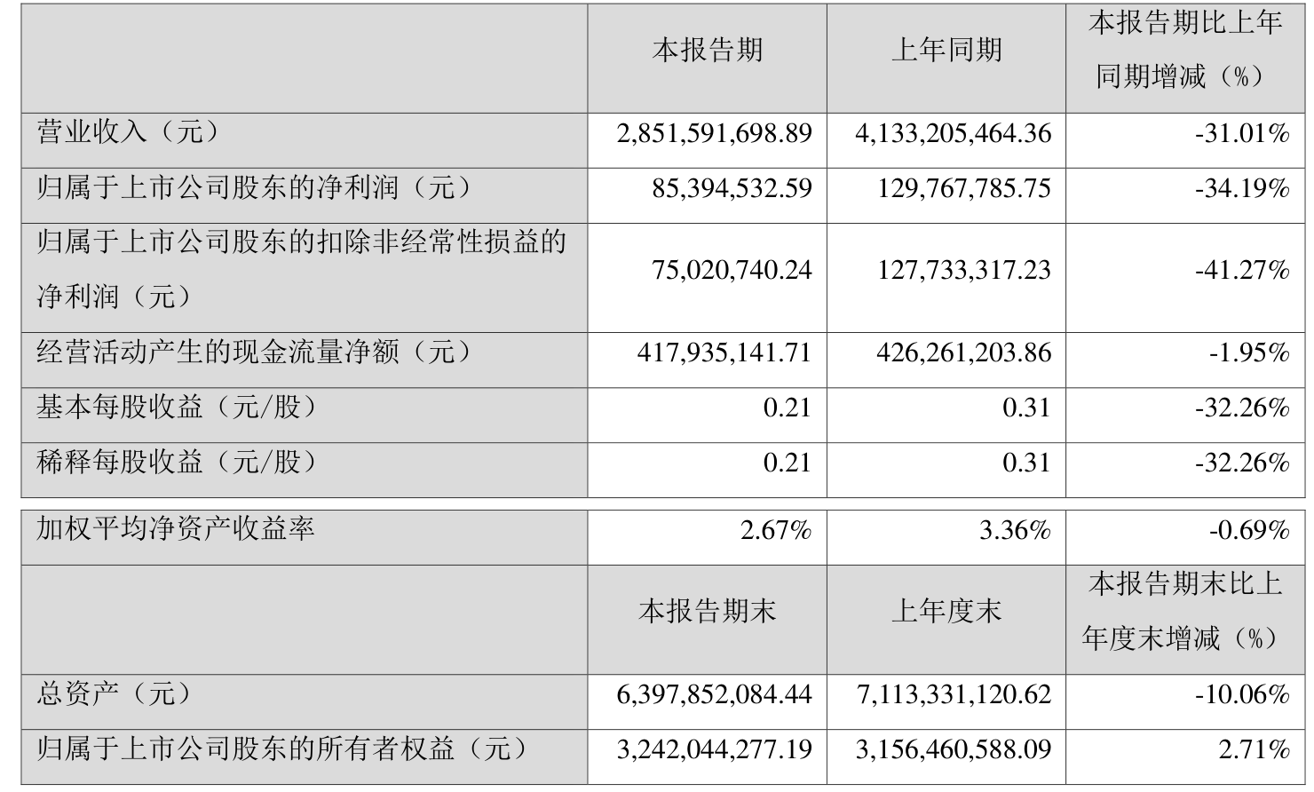 中证智能财讯华致酒行(300755)4月26日披露2025年第一季度报告。公司实现营业总收入28.52亿元,同比下降31.01%;归母净利润8539.45万元,同比下降34.19%;扣非净利润7502.07万元,同比下降41.27%;经营活动产生的现金流量净额为4.18亿元,同比下降1.95%;报告期内,华致酒行基本每股收益为0.21元,加权平均净资产收益率为2.67%。