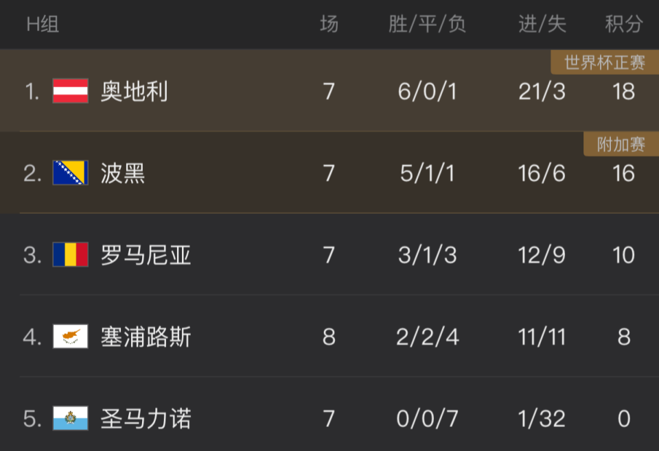 在本轮主场3-1击败罗马尼亚后,积16分的波黑已经锁定了一个附加赛名额,他们将在末轮与积18分的本组领头羊奥地利,争夺一个直接晋级美加墨世界杯的名额。