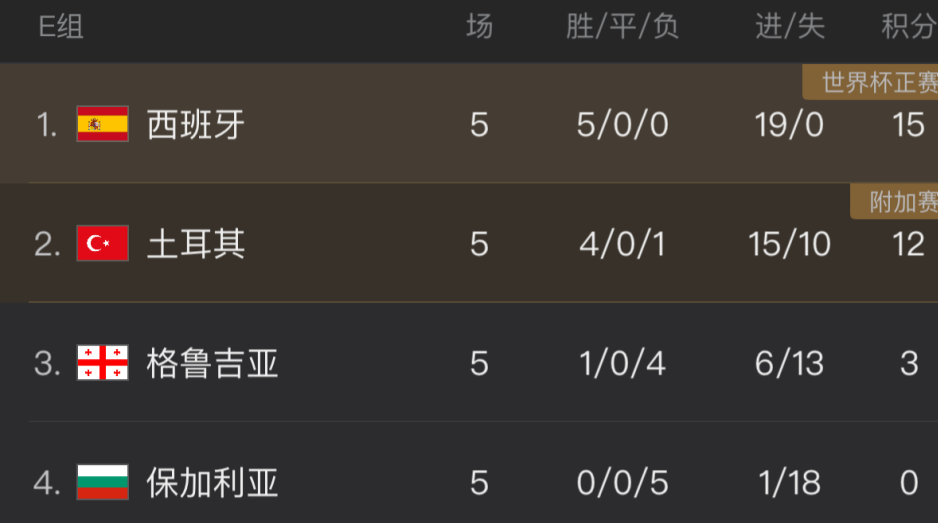 E组形势:末轮西班牙不净负土耳其7球即可出线