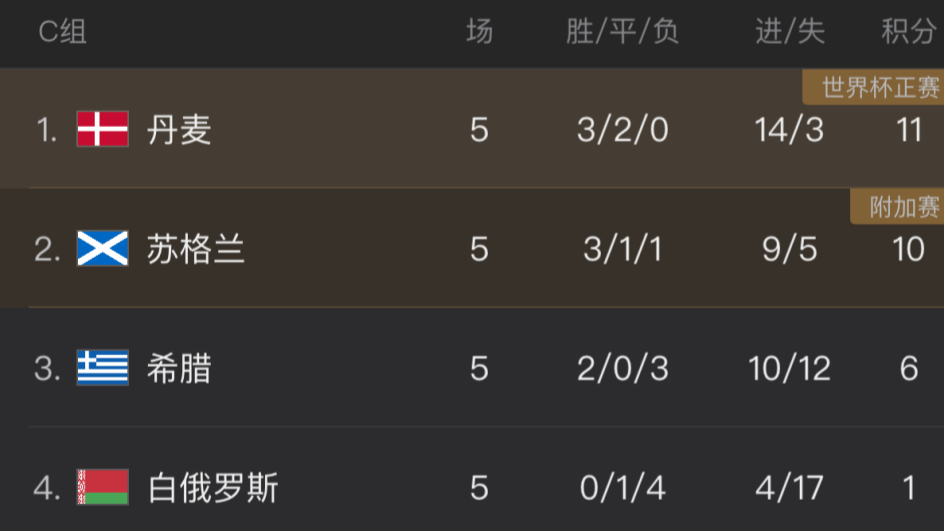 不过手握积分优势的丹麦还是占据主动权的一方——他们在末轮客战苏格兰的比赛中只要不输球,就能够以小组头名的身份直通美加墨世界杯。而苏格兰如果能够在主场击败丹麦,就将压过后者直通世界杯。